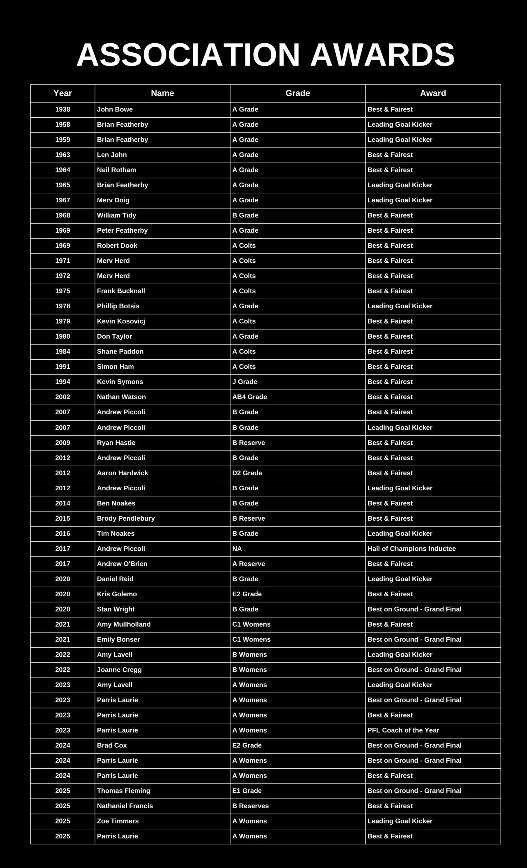 The Wembley Football Club has a rich history in players being recognised for their achievements on the field. The recognition of those achievements are listed below.